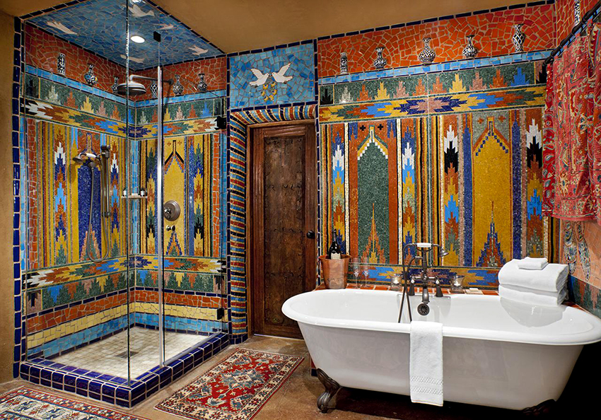 Tiles can be monochromatic, with ornaments, patterns, stained glass, with imitation of wood, stone and mosaic. It has a matte or glossy surface. There are products covered with mother-of-pearl. The shape of the tiles is rectangular, round, square, octagonal and semicircular.Different options for using products can be seen in the photo of the interior of a bathroom with a shower.