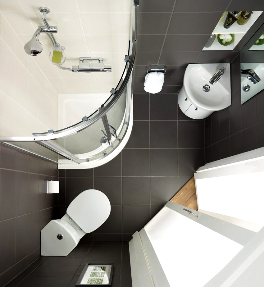There are various options for planning a small bathroom. In a square room, the shower stall is located in the corner. A washbasin is installed nearby. A toilet bowl is placed opposite the booth, if possible, closed by a partition. In rectangular rooms, the cubicle can be installed along one wide wall, opposite which there is a toilet and a sink. In narrow rooms, plumbing fixtures should be placed along one of the long walls.