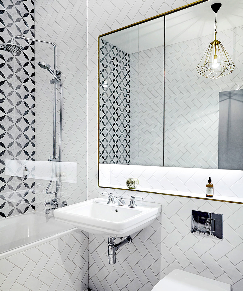 Glossy or semi-glossy ceramic tiles with reflective elements will look harmonious. Large drawings should not be used. A shower room made of mosaics or traditional tiles with geometric patterns of vertical orientation looks most harmonious. You can add contrast by completing a dark floor and choosing bright interior accessories. These can be colored floor rugs, towels or patterned curtains.