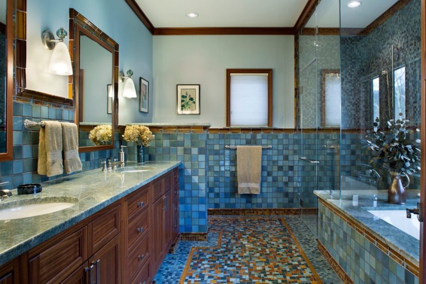 If this option seems rustic, you should add a highlight with color. It is recommended to choose one shade of glass partitions for the shower room, and the doors - another. You can apply a pattern to specific areas.
