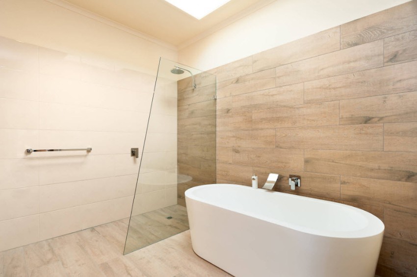 The floor of the moisture board and the glass structures of the shower room look beautiful in the interior of the bathroom