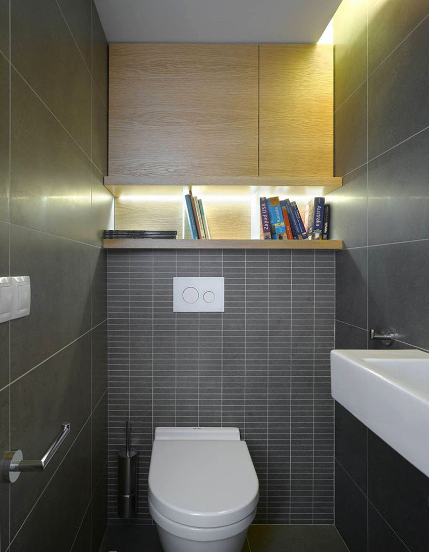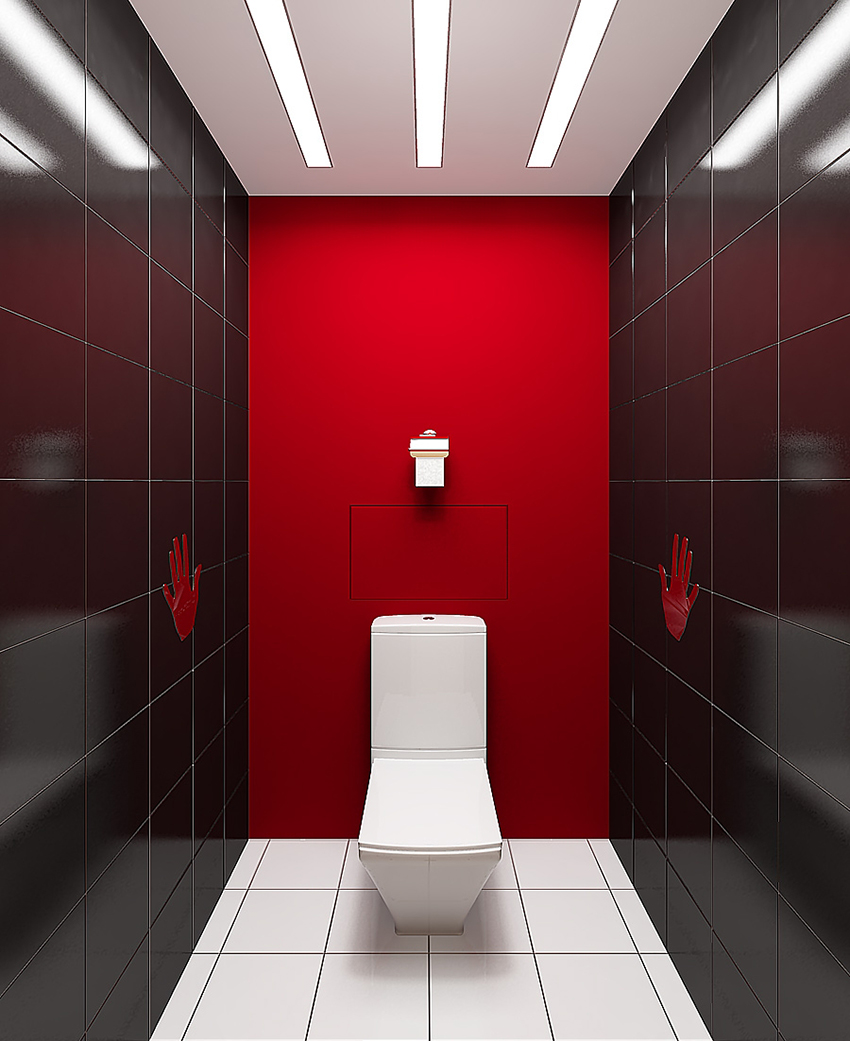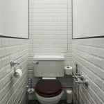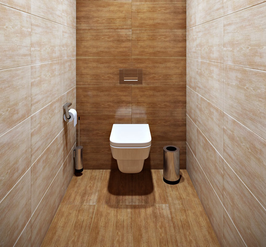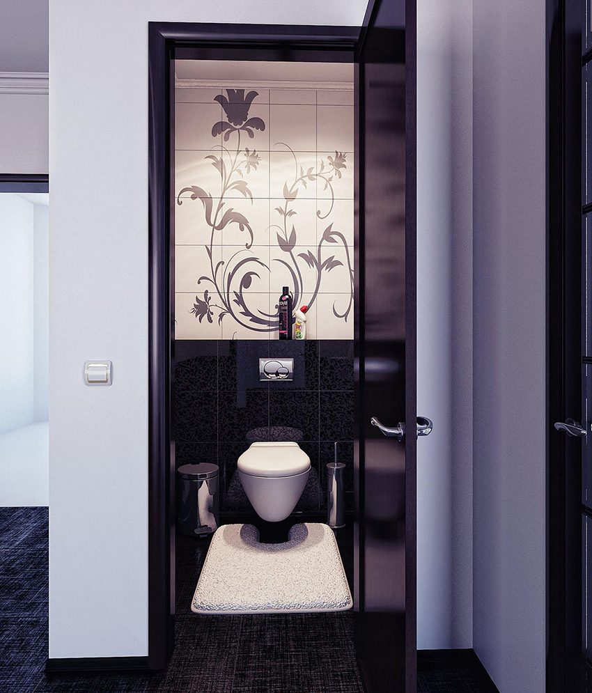 To visually expand the space of a small-sized toilet, the back wall can be completely dark. In this case, the side walls should be light, and best of all, white. Thus, there is a visual lengthening of the room.