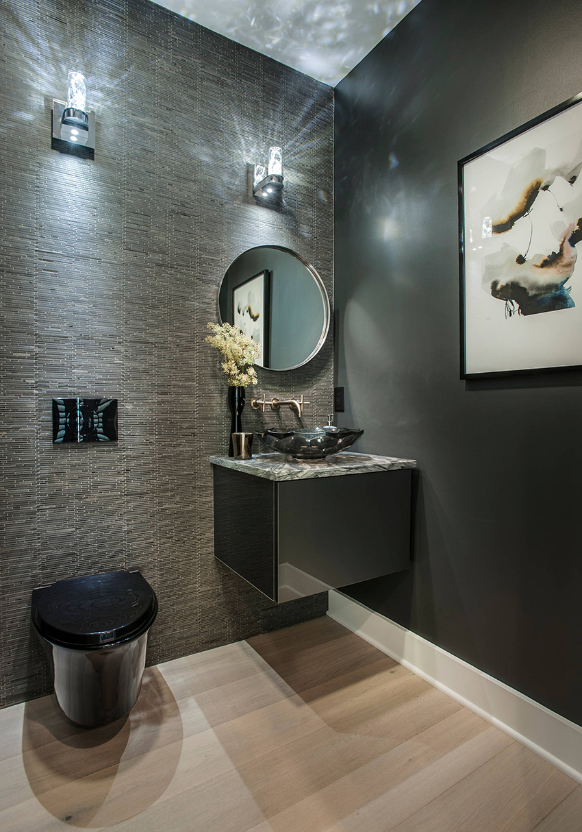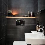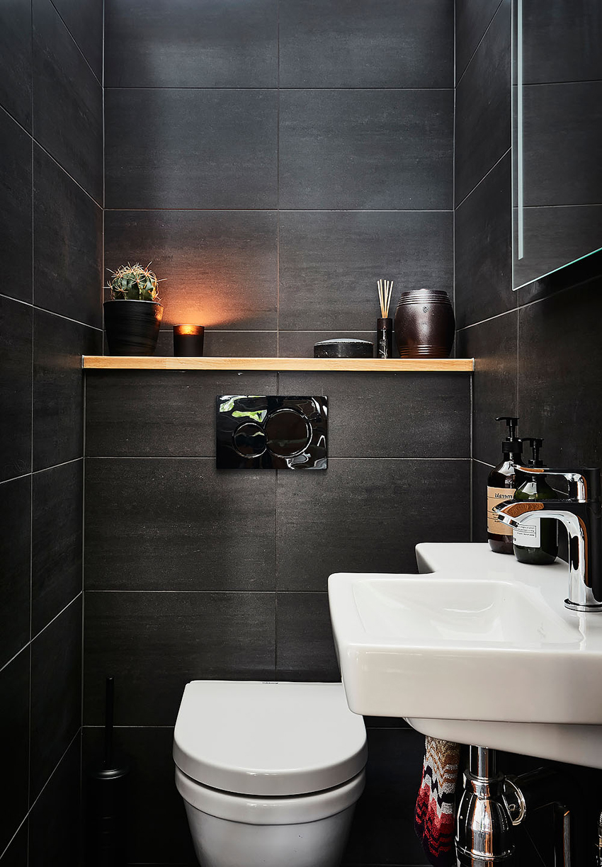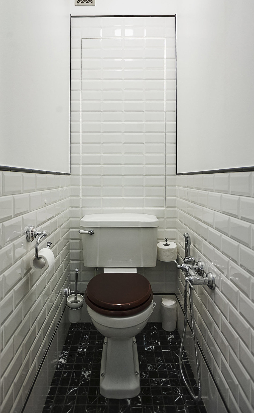 To visually expand the space of a small-sized toilet, the back wall can be completely dark. In this case, the side walls should be light, and best of all, white. Thus, there is a visual lengthening of the room.