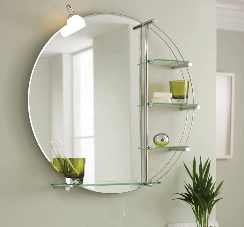 The shelves can be located on the side or at the bottom of the mirror. There are combined models.An interesting look is a mirror in a bathtub with shelves on both sides. They can be attached to metal fittings or directly to a mirror sheet. Mostly they are made of metal or glass. Rectangular or semicircular shelves are available. Models with floating lines in the form of different images look original.