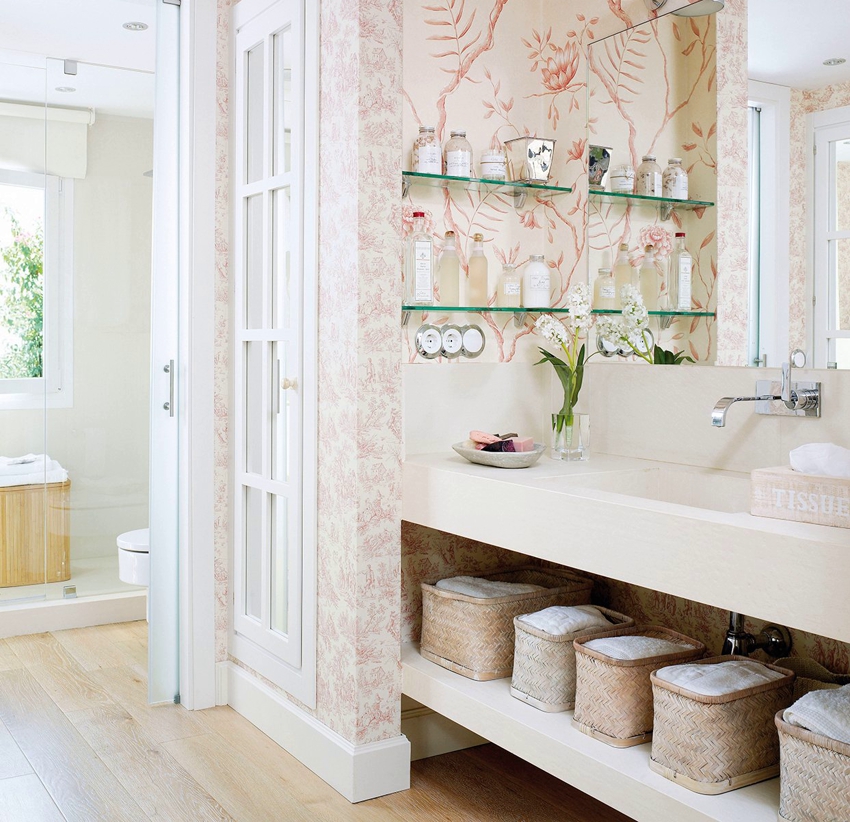 For romantic destinations such as country or Provence, oversized glass or wooden shelves in an oval, semicircular or round configuration would be the best option. In rooms decorated in an oriental theme, built-in shelves in a niche in a bathroom made of tiles or mosaics will look most organic.