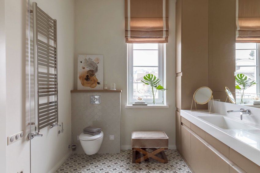Helpful advice! The area under the bathroom can be used for practical purposes by organizing a storage system there with the installation of shelves that will be hidden behind sliding screens.