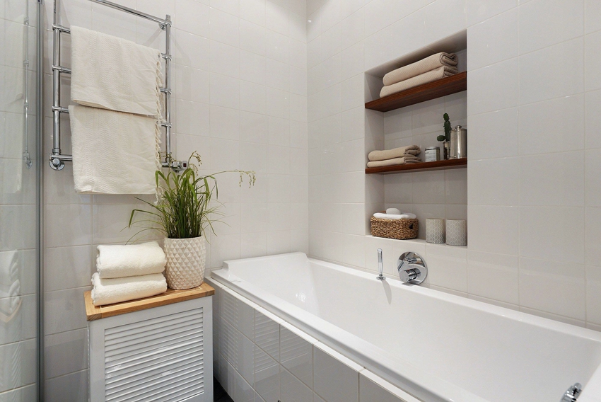 Storage systems in the wall are finished with tiles, artificial stone, mosaics, porcelain stoneware or other material that is used to tiled the bathroom. A mirror can be placed on the back wall of the niche, which will visually expand the space. Built-in shelves in the bathroom facilitate safe movement around the room without fear of hitting a corner of a stationary structure or touching accessories on a wall.
