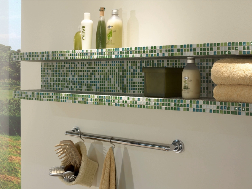 Surfaces decorated with glass mosaics look spectacular. Shelves decorated with mirrored puzzles will become an elegant decoration of the room, contributing to the visual expansion of the space. Salt mosaic in the form of opaque glass has a special property of refracting light. Thanks to this finish, the tile shelf in the bathroom can become an accent element of the room.