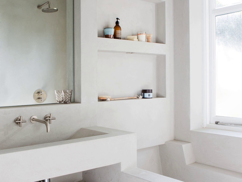 The storage system in the plasterboard bathroom, finished with plaster, looks stylish and original. There are several types of material that create different effects.