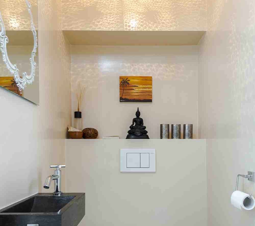 The niche will look impressive and presentable with shelves or a plasterboard countertop in a bathroom finished with Venetian plaster.The composition contains marble flour, which creates a slight overflow on the surface. The material is applied in a thin layer with a spatula. After complete drying, excess and roughness is removed from the surface. Thus, 10 layers of plaster are applied in stages. The final stage of creating a marble surface is the application of white wax and its polishing.