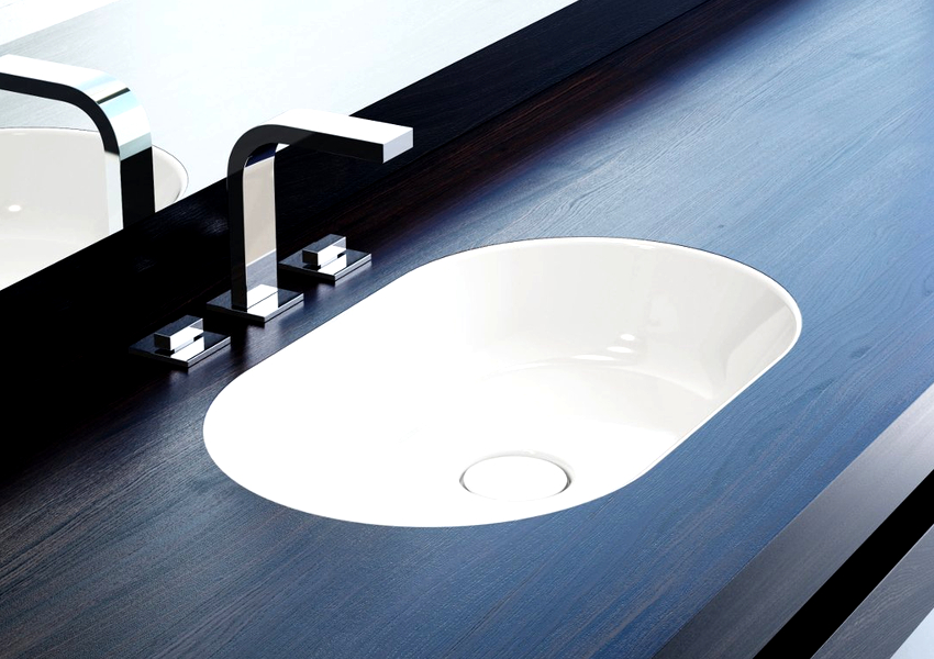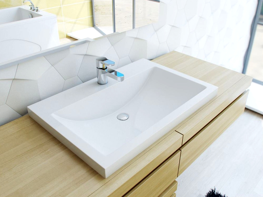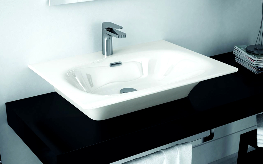 - With partial recessed bowl. The main part of the washbasin is immersed in the cut-out hole, while the sides lie on the countertop. The installation process is simple, the fastening is durable; tight contact of the edge of the sink with the countertop, fixed with a sealant, prevents moisture penetration.