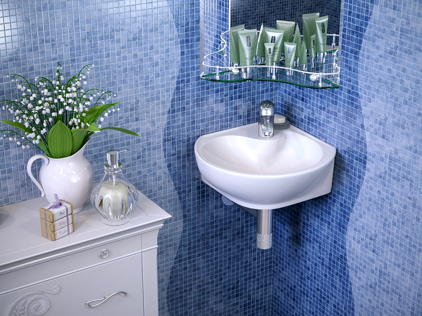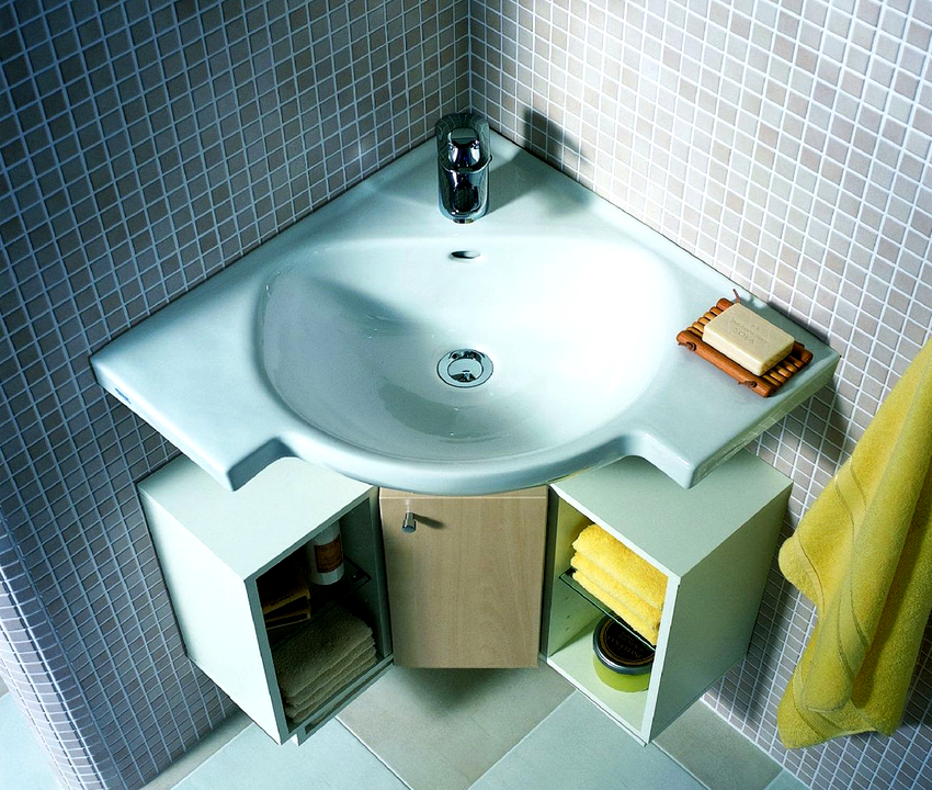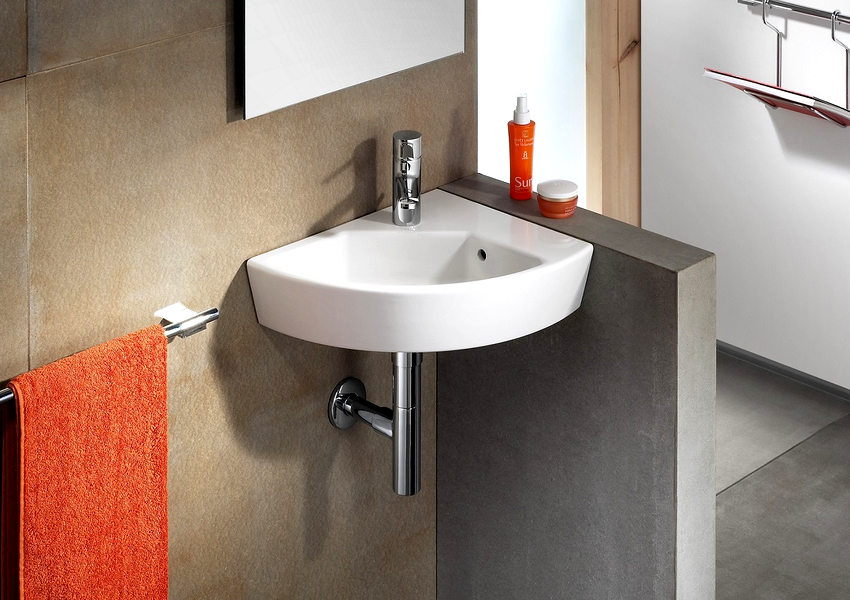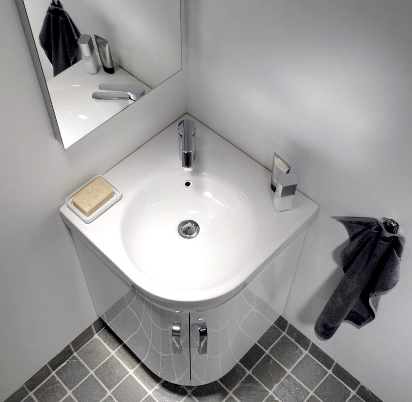 Looking through the Internet product catalogs on selling sites, you can see that among this type of plumbing, such as washbasins, corner models make up 5-7%. And this is no coincidence. Despite the external appeal, the choice of such an option should be approached thoughtfully and responsibly. Occupied corners do not always contribute to the visual release of space.