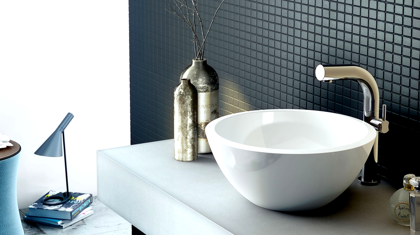 It is also worth noting that the installation of an overhead sink in the bathroom is a simple process that can be dealt with without special knowledge and skills. The bulk of the thicket rests on the countertop.