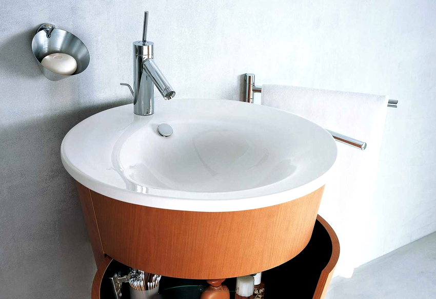 We should also highlight the washbasins, which are mounted in the corners of the room. Such products also have an appropriate shape. It can be both floor-standing and pendant models. If the design has a countertop, then it is she who is made angular, the sink can be round, oval or square.