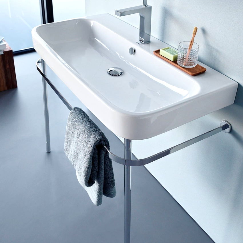 Such sinks are installed on brackets. Usually mounted models have bumpers that serve to accommodate various hygiene items on them, and also allow you to hide fastening devices. Hanging on metal frames is also possible. In fact, these are modernized brackets. The advantage of this type of attachment is the presence of a horizontal pipe in the area under the sink, on which you can hang a towel: when unfolded, it dries well, the main structure of the washbasin protects from water drops.