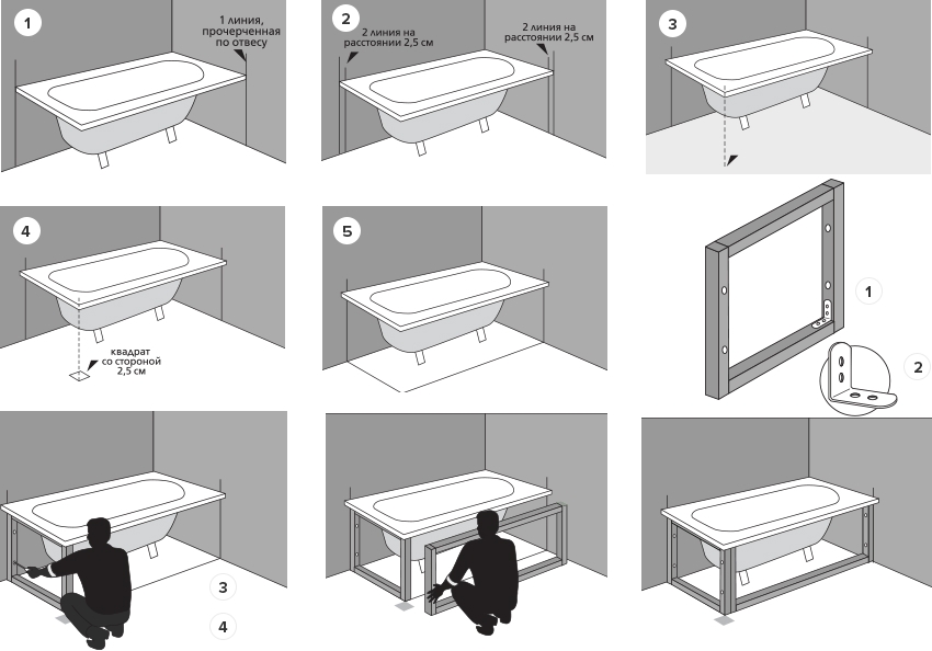 - further, reinforcing structural elements are fixed, which are often used as corners. Fixation is carried out along the marked lines with a drill and dowel-nails. For screens with a length of 150 cm, it is sufficient to make a reinforcing frame around the perimeter. Bath screens 170 cm require more serious reinforcement, namely 1-2 intermediate posts. Sliding screens for a 180 cm bathtub also require the installation of intermediate racks;