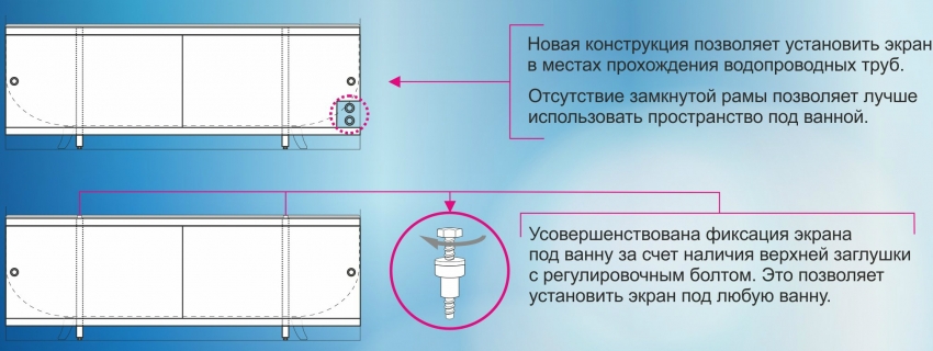 Cast iron baths are the easiest to screen. In this case, it is enough to fix the sliding structure with the legs (you should be careful when fixing the legs of the sliding screen under the 180 cm bathtub). And when shielding an acrylic bathtub, you should be careful, as there is a danger of its lifting when unscrewing the legs. This is due to the fact that an acrylic bowl weighs much less than a cast iron bowl.