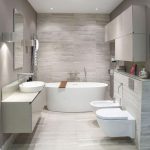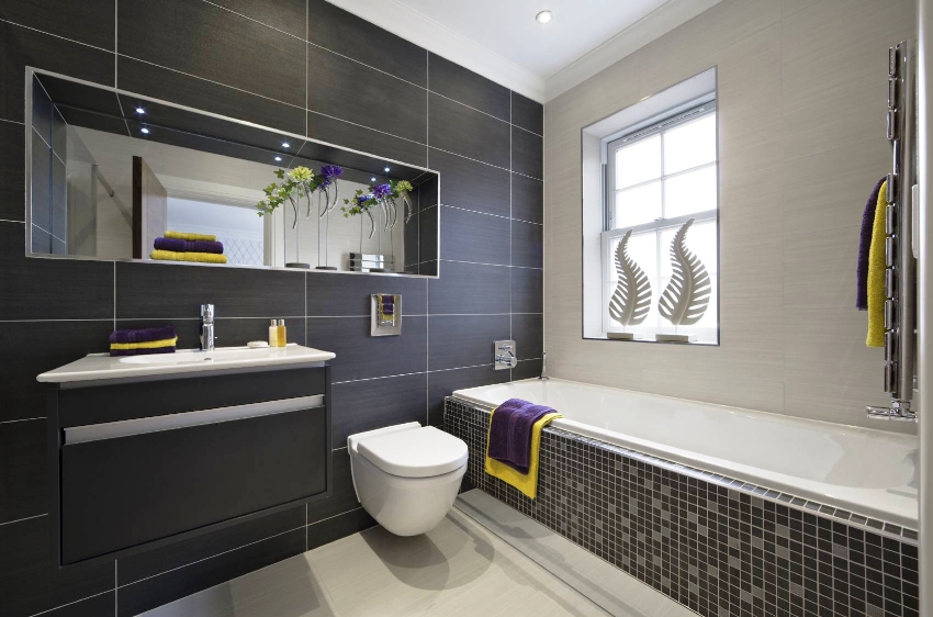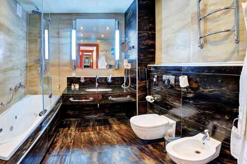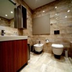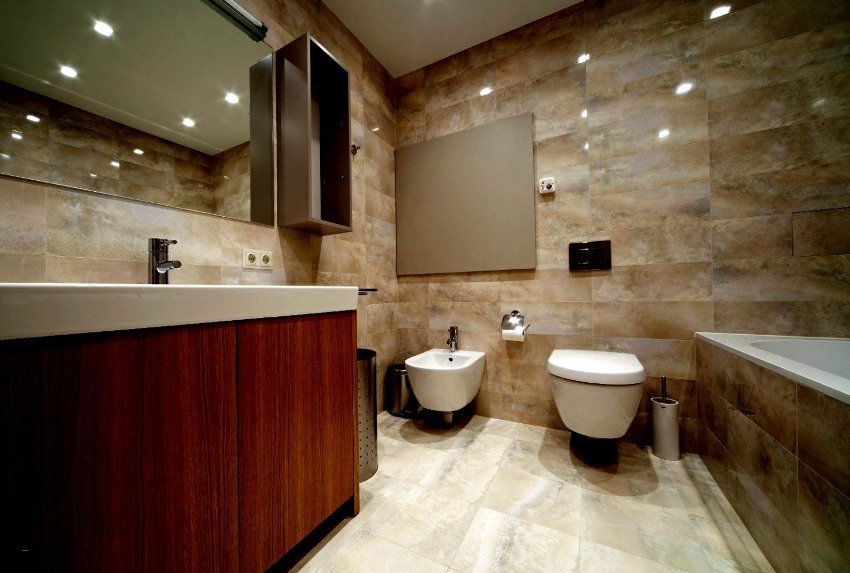 In a large bathroom with an area of 5 m², you can not save on the amount of plumbing and even choose additional accessories, for example, install a bidet or urinal. To provide more intimacy in such a room, you need to separate the toilet with a low partition and, if desired, make a small sink near it for washing hands.