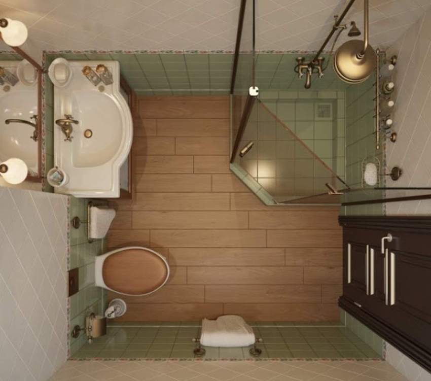 In a small bathroom, combined with a bathroom, the corners should be used as much as possible. A good option is to mount a corner countertop with a built-in sink, under which a space is organized for installing a washing machine. Above the washbasin are located shelves for hygiene products, and in the opposite corner, depending on needs, it is planned to place a bath or shower.