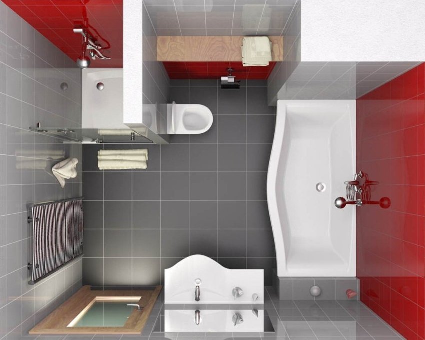 When planning a small bathroom design, it is important to take into account the presence, location and size of niches, protrusions and other wall irregularities. You should not immediately attribute such features of a room to disadvantages, because with a competent approach, they can be turned into advantages. Often, a niche is used to install an installation for a toilet bowl, cabinet-case, or it houses a built-in washbasin with a small bedside table, which hides all unnecessary communications.