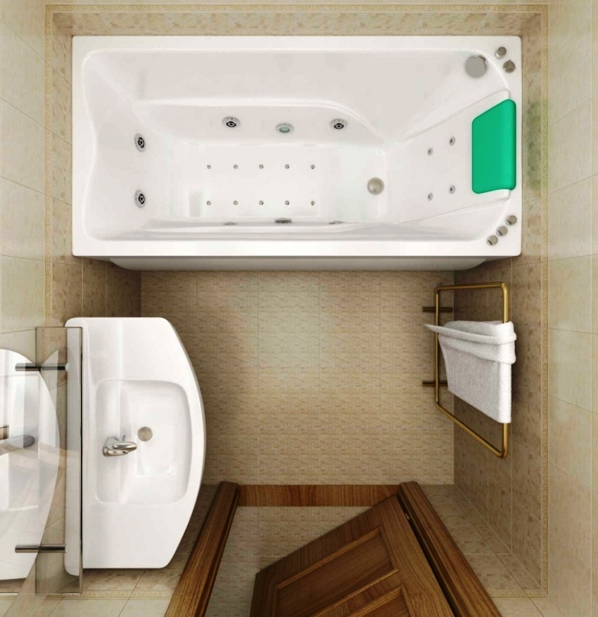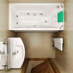 Useful advice! If an ordinary bathtub does not fit into the room in terms of dimensions, it is better to choose a corner model. Even though the bowl will occupy the same area, it will use the area of the unclaimed corner and free up space in the center. It is also better to give preference to hanging corner furniture, which looks more harmonious in a small bathroom.