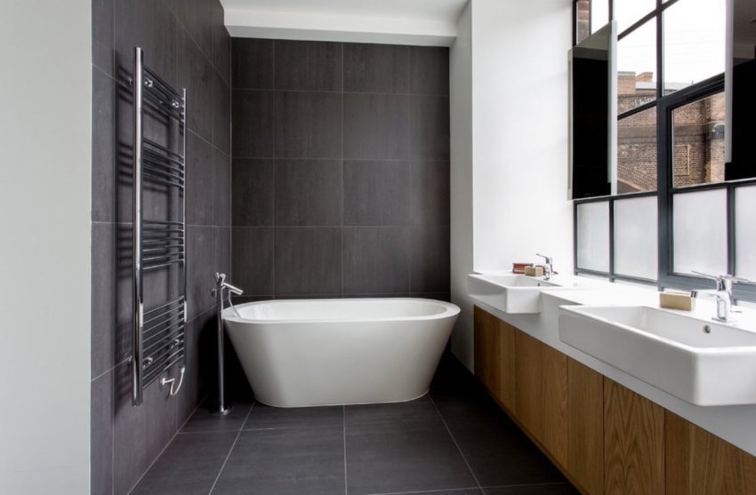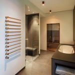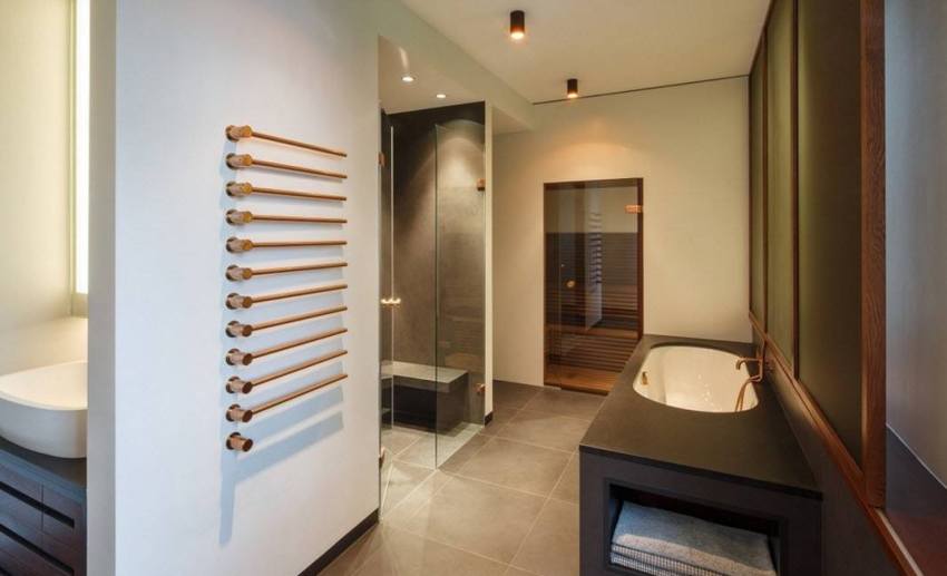 One should not forget about such a mandatory element as a heated towel rail, which is recommended to be installed no closer than 50-70 cm to the shower or bath. It is this distance that is enough to freely reach the device and remove the dry towel.