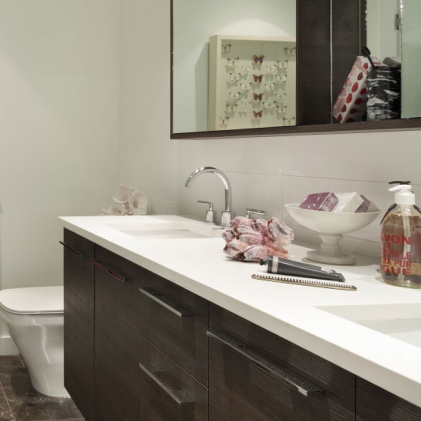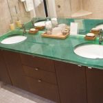 The most popular stone bathroom countertops are acrylic products. This material contains only 7% of natural additives, which makes them lightweight and plastic. These countertops can be assembled from several parts, and the joint remains invisible after grinding. The disadvantage of an acrylic surface can be considered the effect of high temperatures on it - you cannot put hot objects.