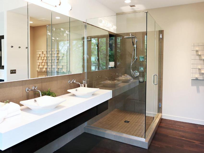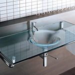 The trend towards the use of glass for furniture and other household items has spread to bathrooms. Cabinets, shelves, curtains and countertops meet all the necessary requirements: