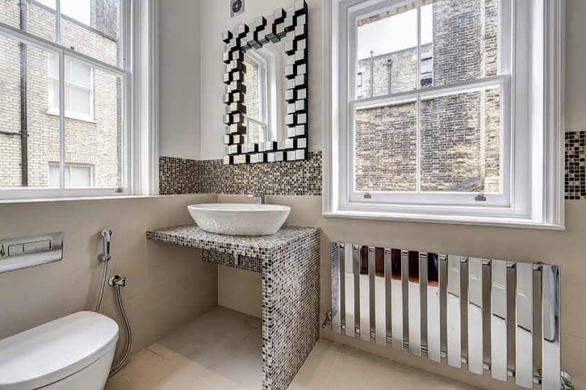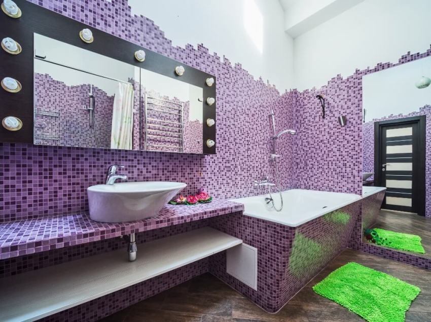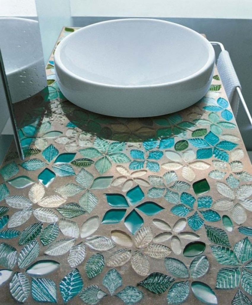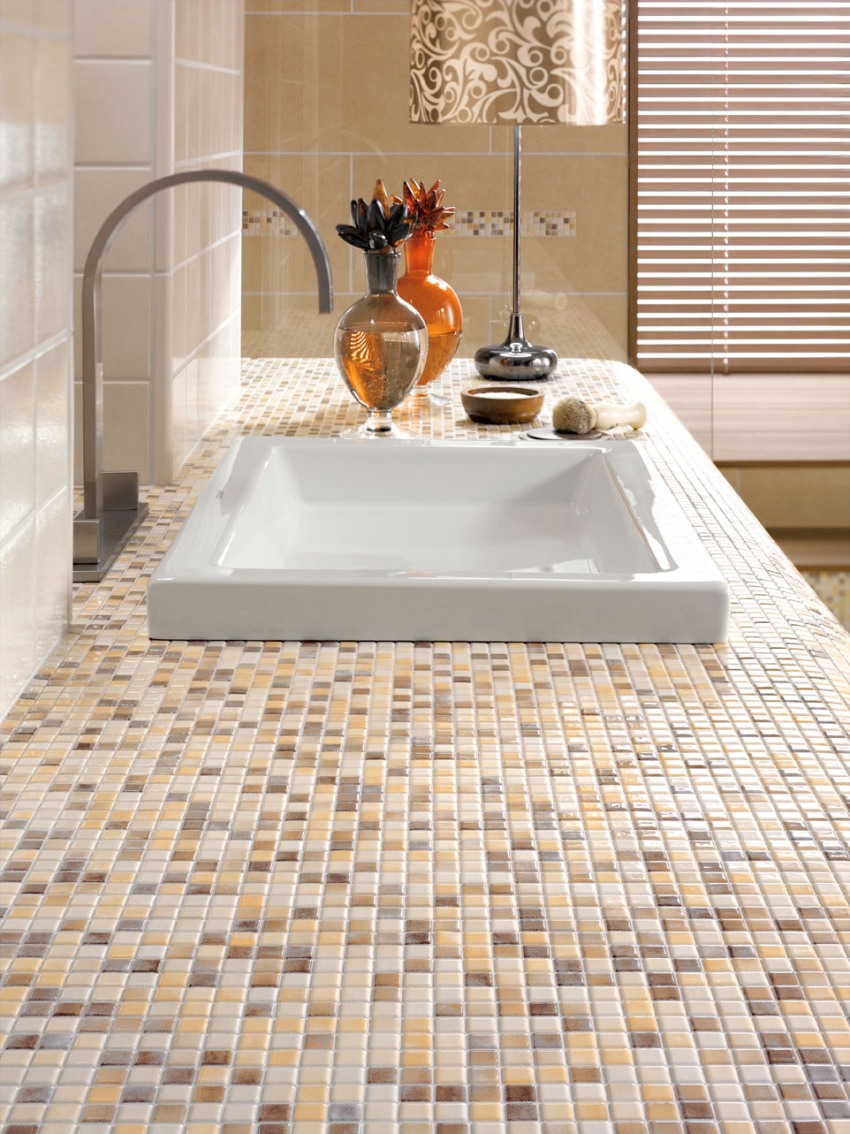 The worktop completes the interior. Considering that wall cladding and flooring are mainly made of tiles, then such a tabletop will be a unique opportunity to give the room's design a special originality. Here you can experiment with sizes (large squares - on the floor, medium - on the walls, small ones overlaid the surface under the sink), color, shape.
