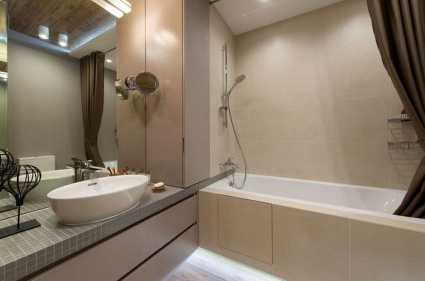 As for the interior, it is provided by a combination of material and shape of the structure. The standard countertop is a rectangular slab. It can have a bedside table or shelf at the bottom.Designers have developed many models of curved countertops, where a rounded part can protrude in the sink area or the entire line of the outer edge can be wavy. The countertop in the bathroom under the sink and washing machine can have several levels. The sink is more often "recessed", built in, but it can also be located on top of the countertop.