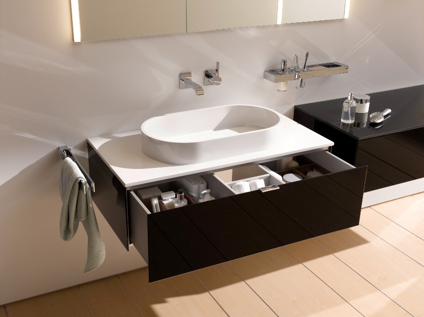 Is this way of placing the washbasin convenient? According to users, this depends on the shape and depth of the bowl, the level of its location and the spout of the mixer. Same features as built-in models. Therefore, the conclusion suggests itself that this installation method affects only the interior.