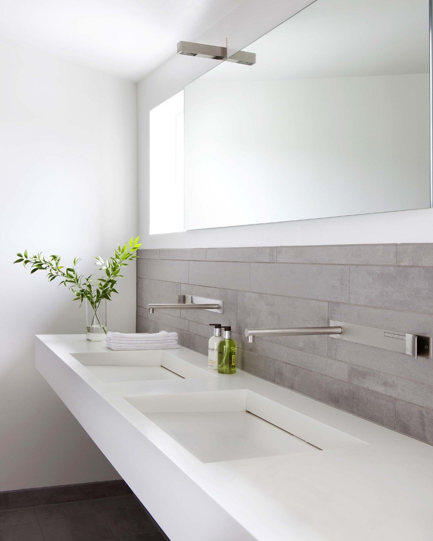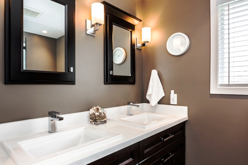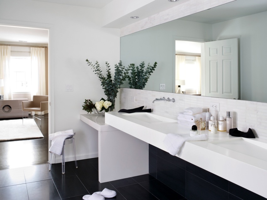 A countertop with a sink in the bathroom should form a single composition, dark granite countertops and white porcelain sinks are excellent options.