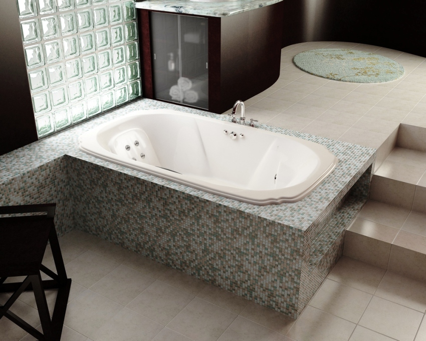 Such baths can take a wall position, angular, solo. A built-in option is most often placed along the walls. If the bathtub is standard, white, you should not focus on it; it is better to arrange the piping in the same style as the wall. In case of colored interior coating, special attention should be paid to the surrounding elements. Such a bathtub, even of a tiny size, should become a decoration of the room. Wall cladding, flooring, details should emphasize the originality of the sanitary ware design.