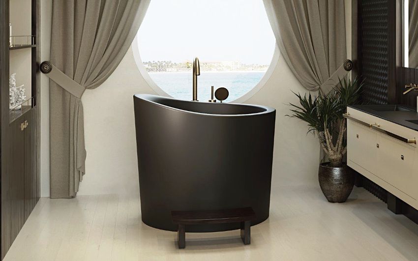 The short bathtub, which looks like an egg, is installed on the floor without any coasters. The absence of additional elements makes the product especially laconic. Some difficulty is caused by the summing up of communications: they must be built into the floor. This bath is the most compact model of all presented on the Internet.