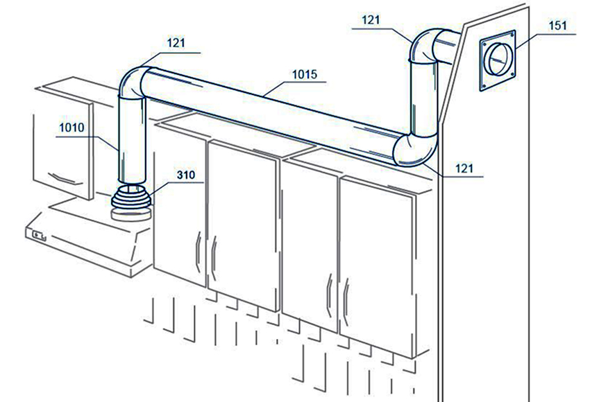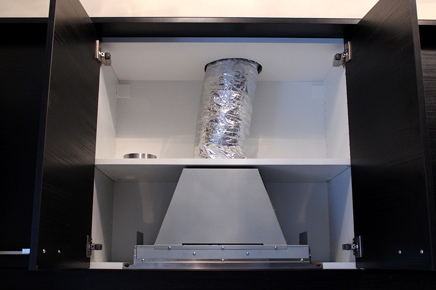 However, most often, the hood, along with the pipe, is hidden directly in the headset cabinet. At the same time, there is still enough space in the middle of the hanging furniture for placing kitchen items and dishes. In this case, it would be more appropriate to manufacture custom-made furniture, where the masking of the pipe is provided for by the headset project. The module is designed in such a way that it is possible to trim the side and rear walls to the required size, and the cabinet facades will serve as the main masking element. As a result, the headset fits harmoniously into the interior and looks organic. It is quite easy to replace and dismantle pipes in such a structure.