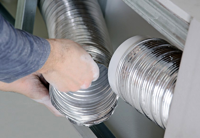 The simplest and at the same time the most reliable way of connecting several pipes to each other is the method using aluminum tape. For this, point joining of the edges of the air ducts and fixing the junction with tape are made. The adhesive tape will ensure a reliable connection of 2 parts of the pipe and protect the channel from depressurization. Finned tubes can also be joined using clamps. To do this, the edges of both parts are pre-applied sealant, then connect them and fix them with a screw on a clamp.