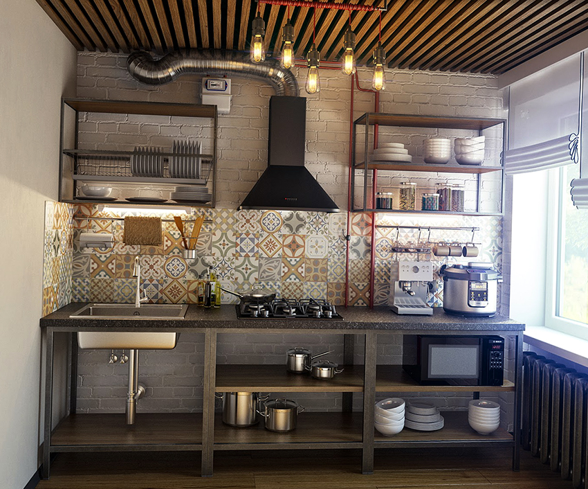 A creative solution can be a loft-style kitchen design, when the corrugation is not hidden, but on the contrary, they focus on it.Experienced modern designers will tell you how to correctly beat the shiny corrugated pipe in the interior so that it does not spoil the appearance of the kitchen, but, on the contrary, becomes its decoration and highlight. Fans of classic styles should choose one of the disguise methods. How to implement each of them, we will consider below.