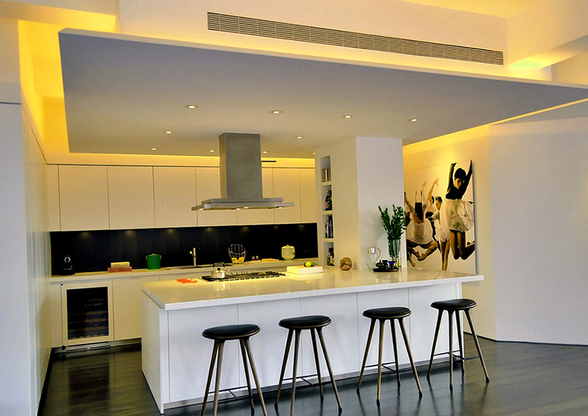 Quite often, it is the pipes under the ceiling with a noticeable and peculiar shine that spoil the stylish and harmonious look in the new kitchen, so the final process in installing corrugated pipes is their masking. This process has no functional background, but is considered an important condition for the aesthetic design of the kitchen.