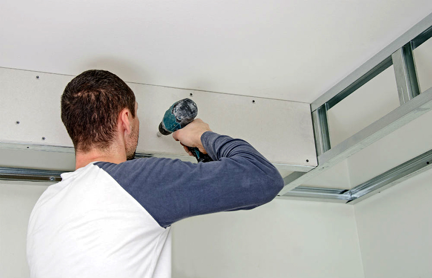 Masking with drywall sheets is performed in several stages. First, a crate is created according to the dimensions of the pipe, for this you can use ordinary metal profiles. Next, the frame is sheathed with plasterboard sheets and fixed on one side to the wall, and on the other to the ceiling. The box can be of various dimensions and looks good as an addition to a suspended ceiling, consisting of several levels, which is also mounted from plasterboard.