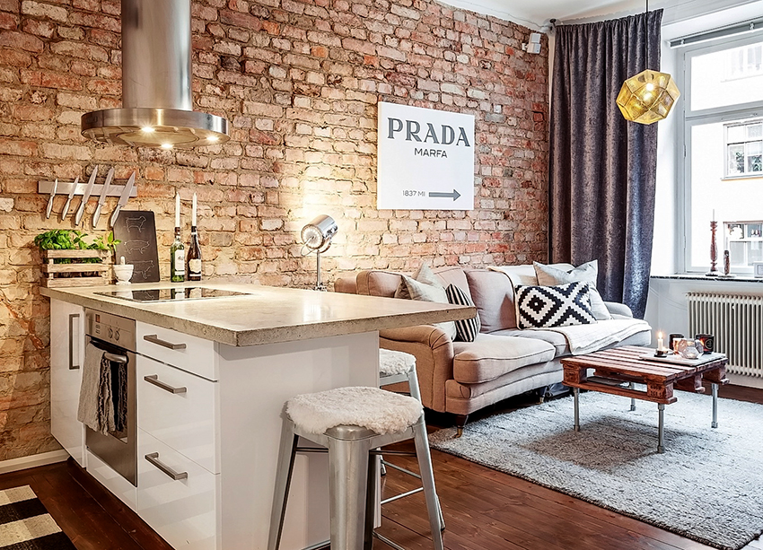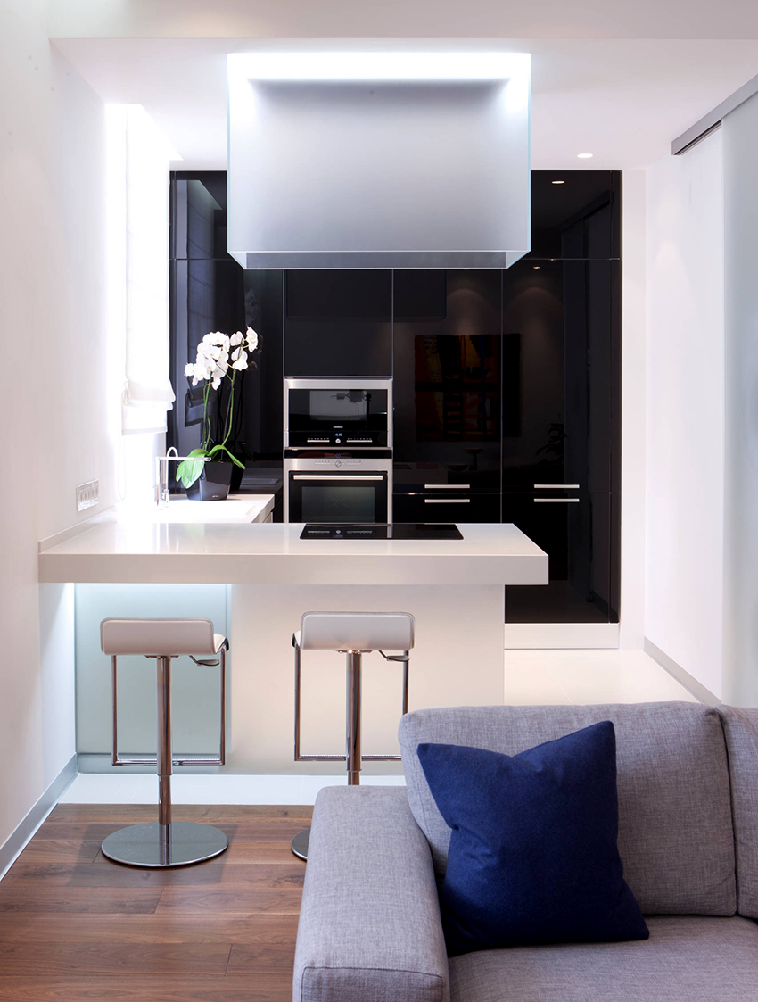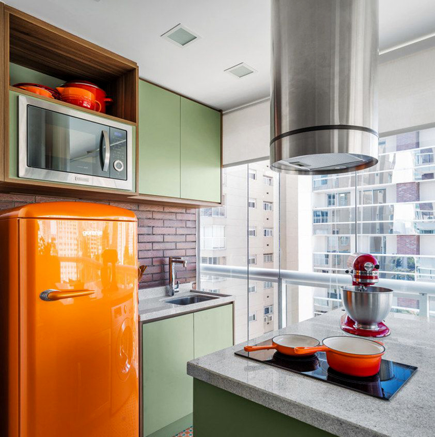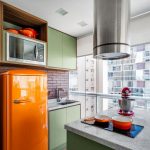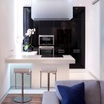 A small kitchen area is not a sentence. You should not give up interior and functional innovations, you just need to reasonably dispose of the available space. There are also small island hoods for miniature rooms. Domestic models are recommended to avoid. They seem bulky in a small space.