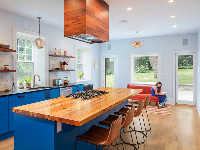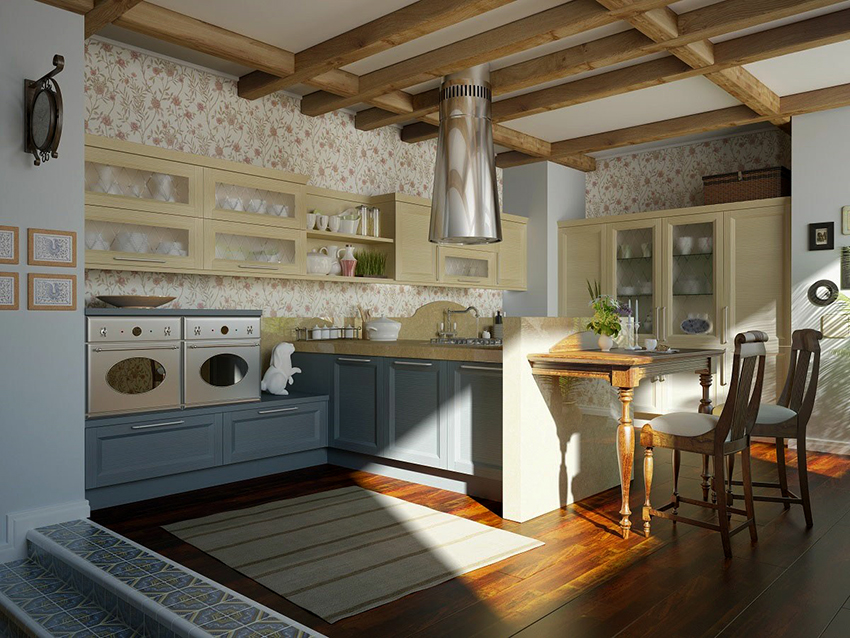 It is not easy to install a hinged hood in a small space, the body of which is a square pipe ending in a flat rectangular umbrella. With the small dimensions of the room, the working surface of the island is usually made narrow. The hood appears to protrude beyond the table, even if it is level or slightly less. This placement does not create physical barriers, but it causes a feeling of discomfort.