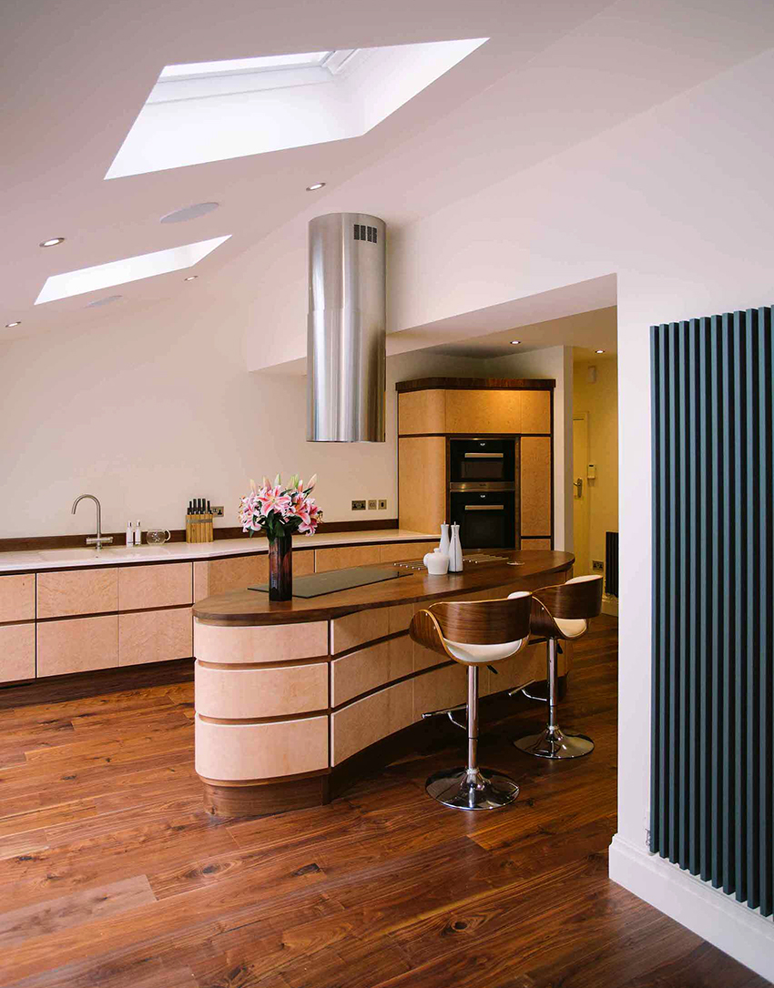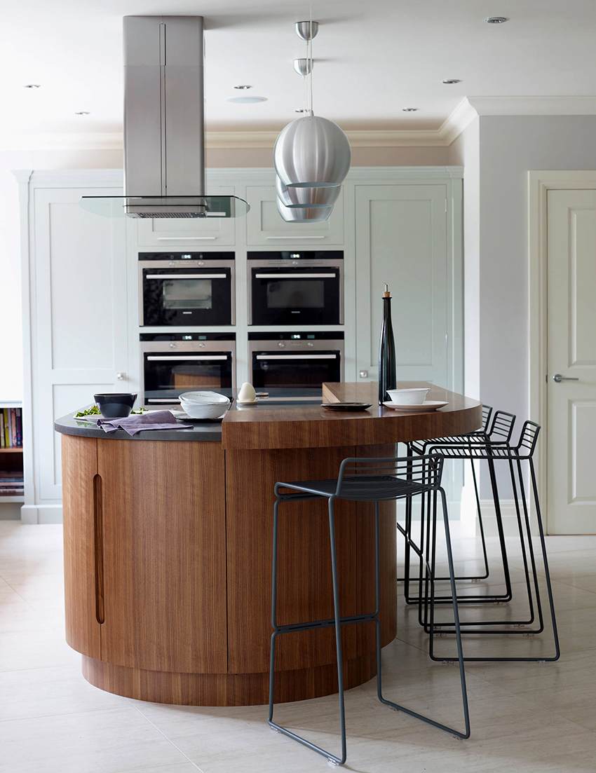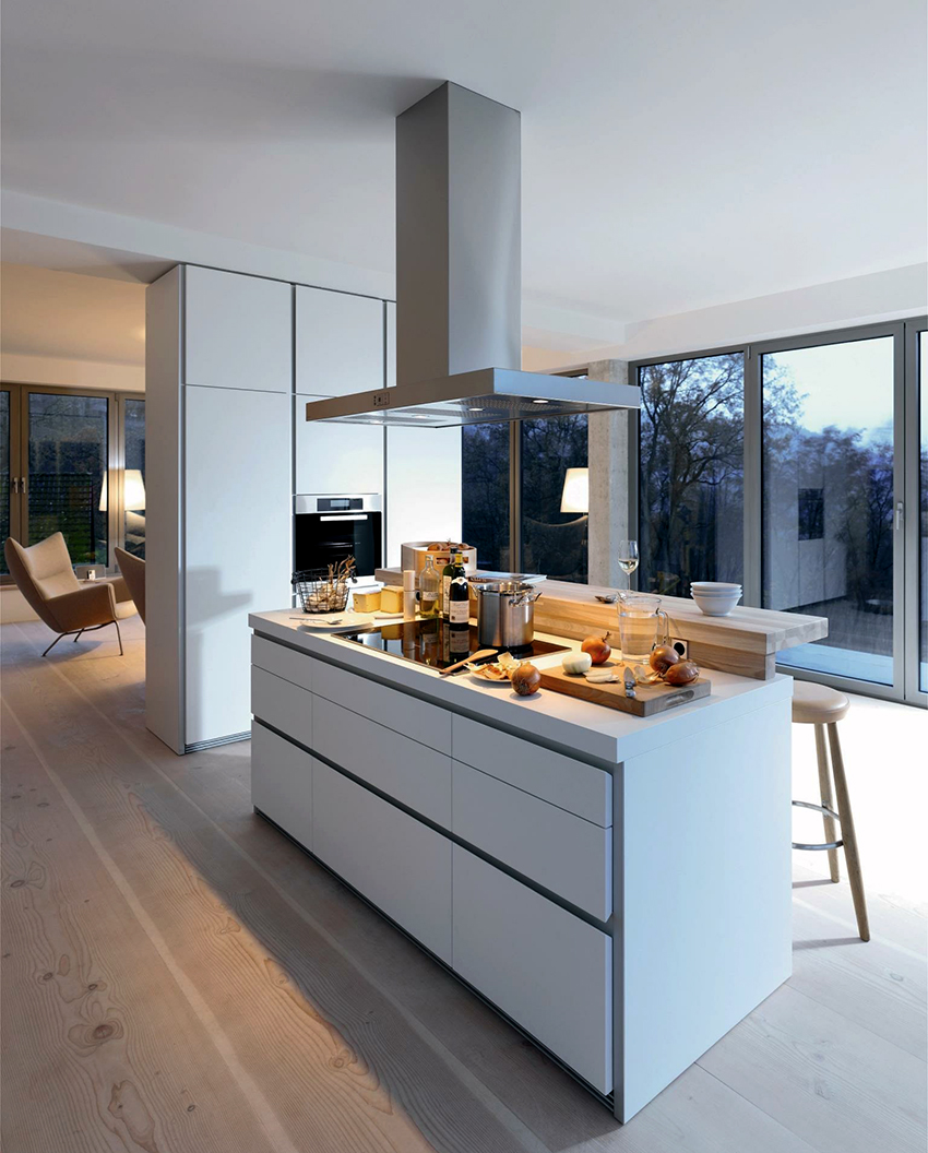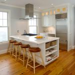 It is worth giving preference to cylindrical hoods. Together with the rounded corners of the countertop (this is an option), they will create an excellent composition and a comfortable workspace in a small island kitchen. Such hoods of white or other light shade are able to visually increase the height of the room.
