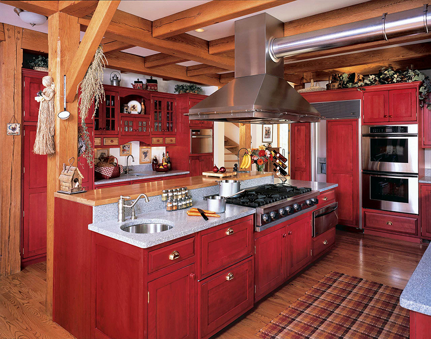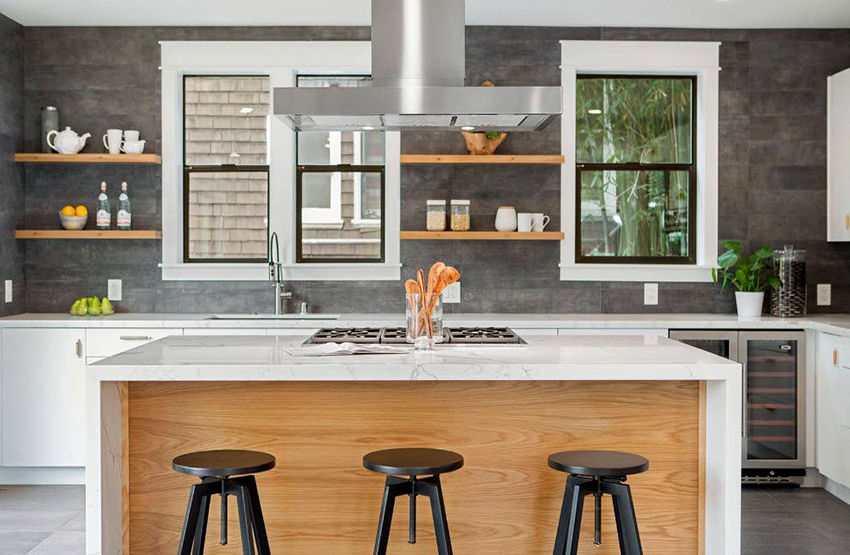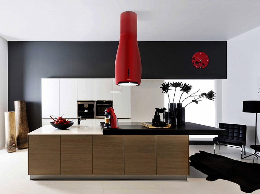 With a dome and a round pipe, the cooker hood will perfectly complement the island part of the kitchen. This composition softens massiveness, creates comfort and coziness. And the presence of angles and straight lines will add scale to the interior, a sense of solidity, reliability.