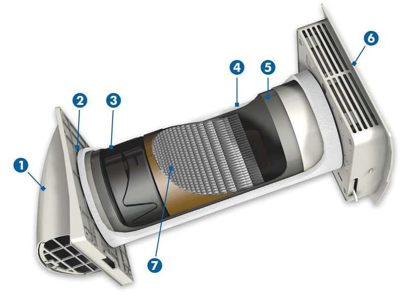 Internal structure of the recuperator: 1 - outer casing; 2 - fan; 3 - filter; 4 - insulated casing; 5 - adjustable body; 6 - decorative panel with a switch; 7 - ceramic element