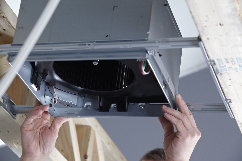 As a rule, a device for forced air extraction is installed at the inlet to the duct. The device is fastened using dowels, which are threaded through the holes on its body. When installing, it is very important to fix the fan as tightly as possible. This can be done using silicone sealant or polyurethane foam.