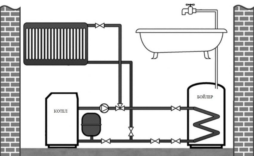 If hot water is not drawn for a long time interval, it will start to cool down. It may take several minutes to wait until the hot stream reaches from the boiler to the final consumer. Reducing the time for draining the cooled water is ensured by using a piping scheme for an indirect heating boiler with recirculation. This is realized by organizing the forced movement of the heated flow through the pipelines closed in a ring.