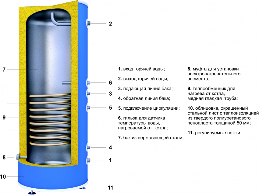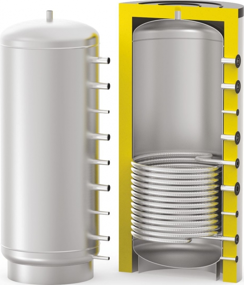 It is possible to heat water in the unit under consideration using a gas or solid fuel boiler, solar water heater or heat pump. Moreover, its operation is possible in conjunction with heating equipment of two types: single and double-circuit.