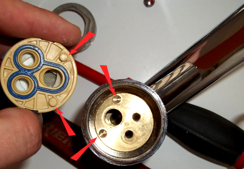 Depending on the internal device, there are types of mixer cartridges such as ball and disc. The first version of the product is represented by a hollow metal ball equipped with communicating holes. The work of such a locking mechanism is as follows. At the moment of movement of the lever, the ball closes the holes from the supply channels of cold and hot water, due to which the flows are mixed.