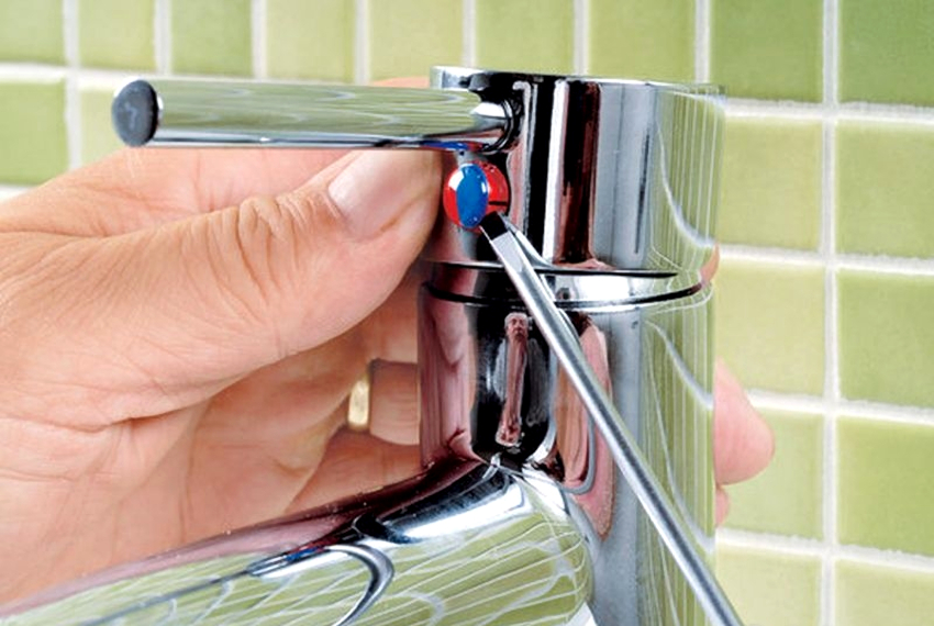 At the first stage, the supply of cold and hot water is shut off, which will prevent flooding. There is a decorative plug under the pivot arm, which is simply inserted into the hole. To dismantle it, you will need a screwdriver, with which you need to pull out the element.