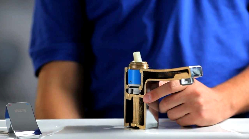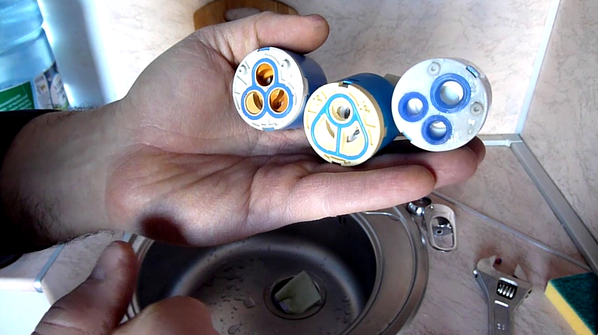 Depending on the material of manufacture of the internal closure, there are ceramic and metal locking mechanisms. The ceramic cartridge for the mixer is a simple design with two or three plates as the main elements. These ceramic discs fit snugly against each other, providing, thanks to the presence of three holes, regulation of the intensity of the flow of water and its temperature. These cartridges are more durable, are characterized by quiet operation, the ability to smoothly adjust the water pressure.